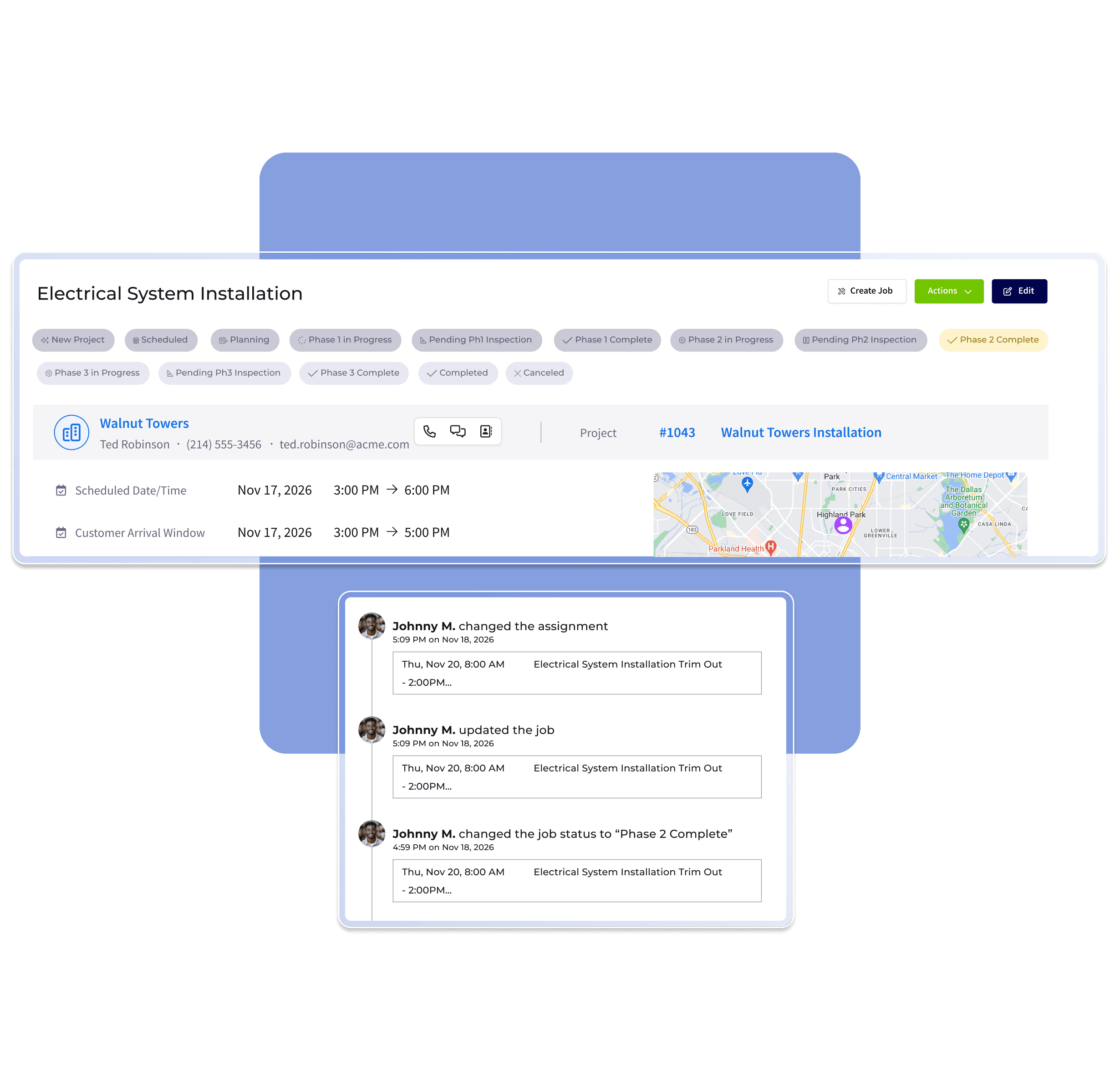Real-Time Progress Tracking: Update job status with a tap—no calls to the office, no confusion.