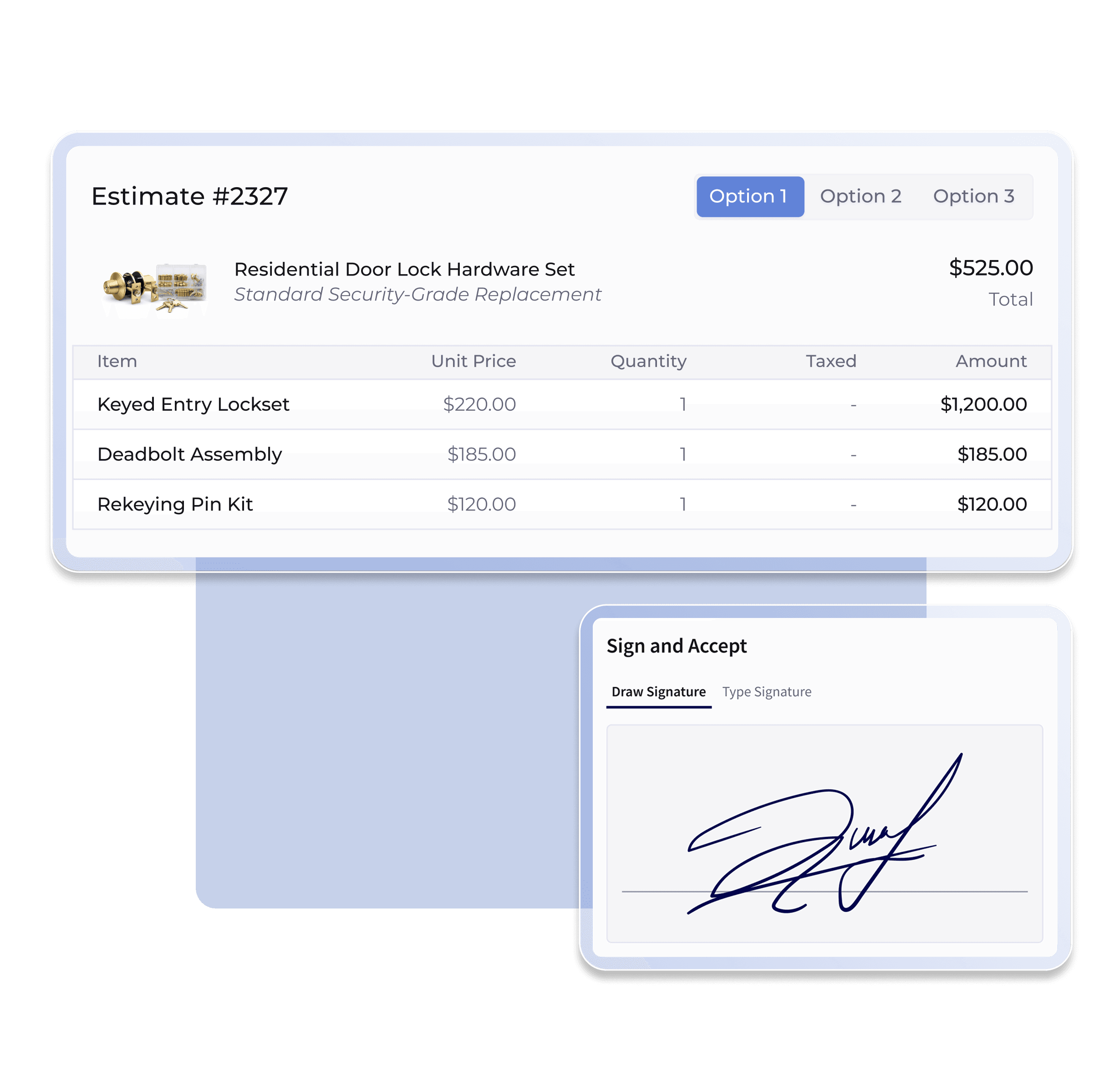 Pre-Set Service Pricing: Select from pre-approved locksmith services to build estimates that reflect consistent pricing across every job.